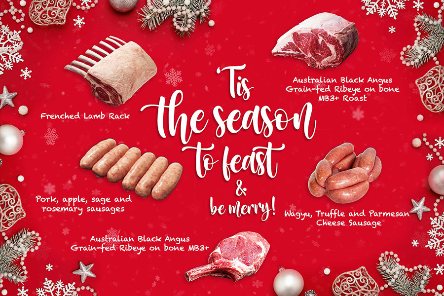 Top picks: The Prime Rib Roast Christmas Bundle ($255) includes Australian Black Angus Grain-fed Ribeye On Bone MB3+ Roast (3kg, raw); Wagyu, Truffle And Parmesan Cheese Sausage (500g, raw) & Pork, Apple, Sage And Rosemary Sausage (500g, raw). The OP Rib Christmas Bundle ($121) Australian Black Angus Grain-fed Ribeye On Bone MB3+ (1.1kg, raw); Pork, Apple, Sage And Rosemary Sausage (500g, raw) & Pork, Apple, Sage And Rosemary Sausage (500g, raw, chilled). The Striploin Roast Christmas Bundle ($171) includes Australian Black Angus Grain-fed Striploin MB3+ Roast (2kg, raw); Wagyu, Truffle And Parmesan Cheese Sausage (500g, raw) & Pork, Apple, Sage And Rosemary Sausage (500g, raw). The Lamb Rack Christmas Bundle ($104) includes Australian White Pyrenees Frenched Lamb Rack (700-900g, raw); Wagyu, Truffle And Parmesan Cheese Sausage (500g, raw) & Pork, Apple, Sage And Rosemary Sausage (500g, raw). All meat products are chilled, never frozen.