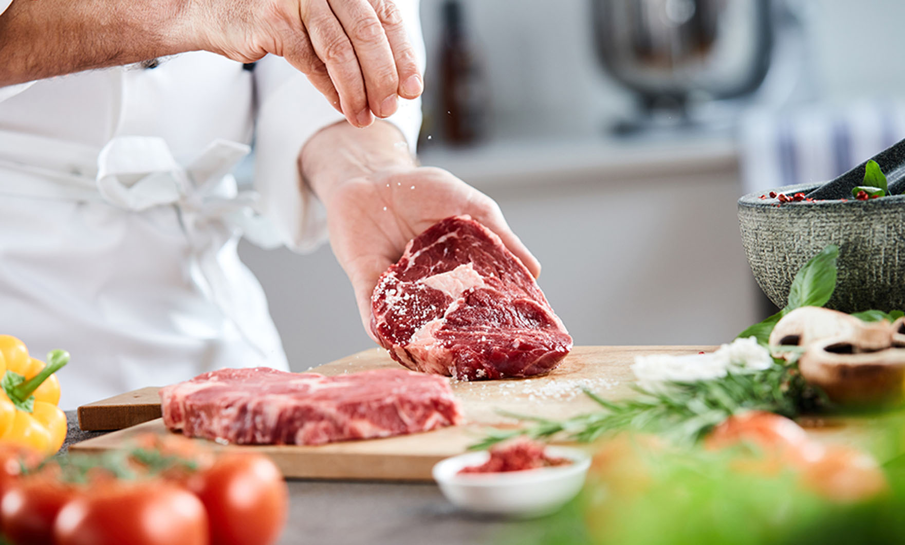 Before seasoning your meat, make sure to pat it dry with kitchen towels, as a moist slab of meat will prevent a nice crust from forming. Once the meat is dry, season the meat generously with kosher salt, as this will help build up a lovely crust. We prefer to use kosher salt – a coarse, flat grained salt without additives, as it enhances the flavour of meats instead of making them taste salty. Kosher salt also contains no iodine, which can lend a bitter taste to foods.