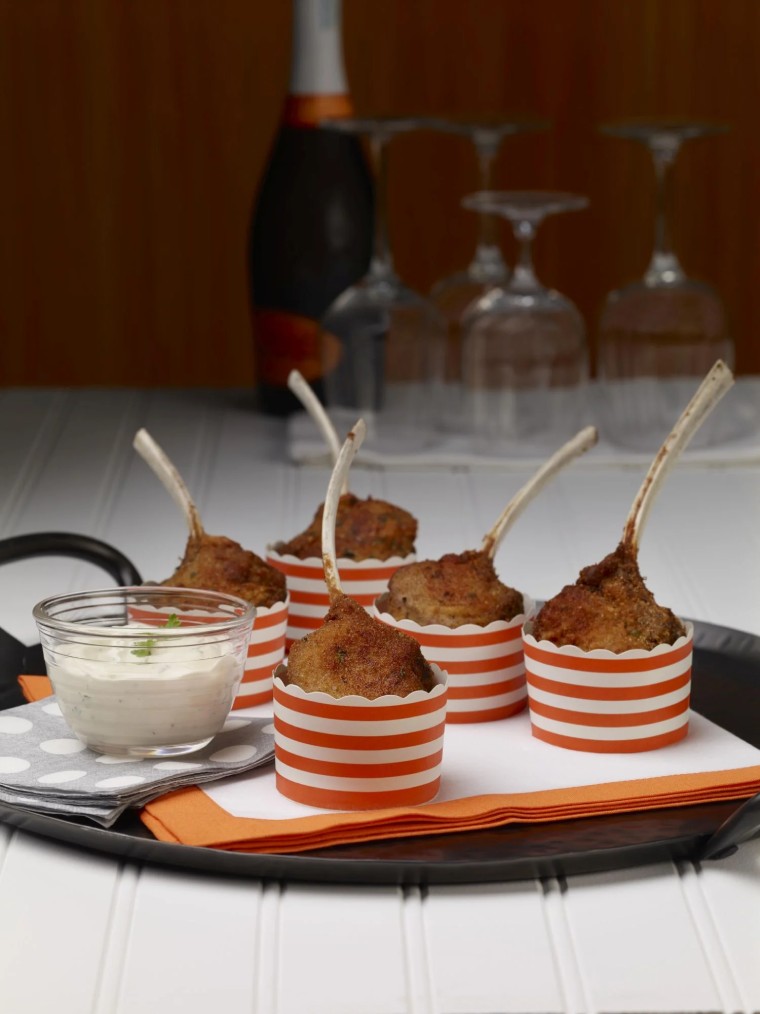 Dip each lamb chop into the flour, then egg wash, then crumb mixture, until each one is covered generously with the mix.